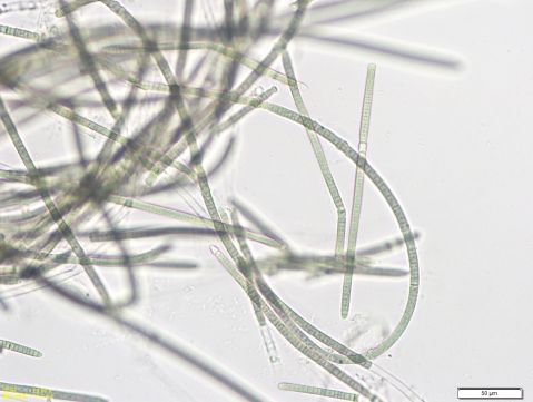 写真1 藍藻類シュードアナベナ属の顕微鏡写真(バーは50μm)