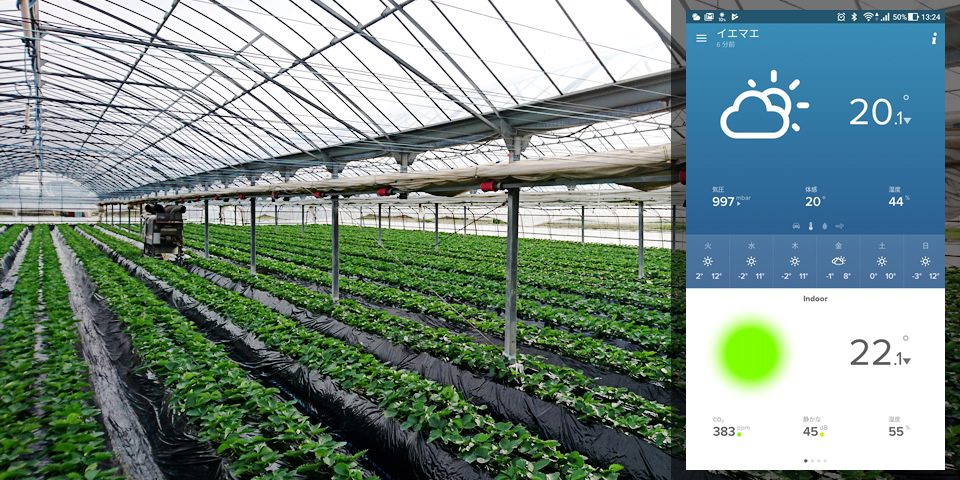 栃木県にはとちおとめという有名なブランドイチゴがあります。とちおとめの生産ではビニールハウスを利用しますが、これはイチゴの生育環境を調整し収穫時期を操作するためです。露地栽培のイチゴの収穫時期は4〜6月ごろですが、ハウス栽培では1年を通じてもっとも需要が高い12月(クリスマスシーズン)にあわせて生産を行っています。このため、ビニールハウス内の温度・湿度・二酸化炭素濃度など詳細なデータを利用したいという要望が高いのです。本研究では本学OBの農家さんと共同で、ビニールハウス内のリアルタイム環境監視を行っています。