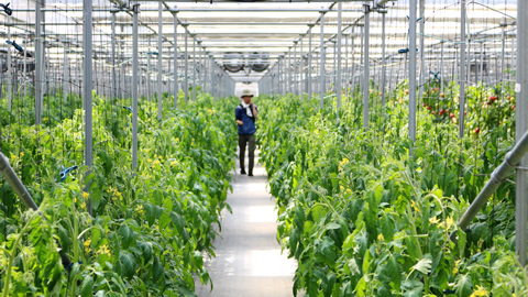 農大OBの農業法人では、トマトの水耕栽培技術を確立し、安全・安心・高品質のブランド・トマトの生産を行っています。最新の種苗育成技術、水耕技術、大型ビニールハウスを使い1年を通じてトマト生産を行い、ほぼ毎日、出荷ができる優れた技術を開発しました。この農家さんのご協力のもと、農業ICTの応用について共同研究を行っています。