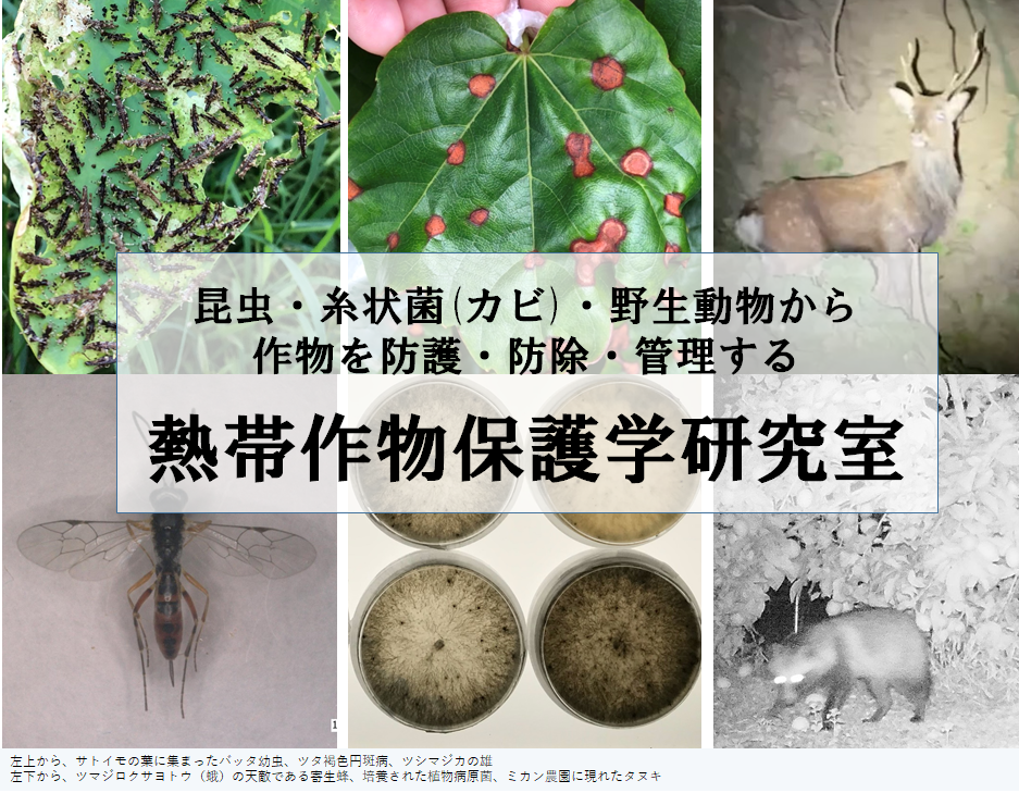 熱帯作物保護学研究室では、農作物を昆虫や糸状菌(カビ)、そして野生動物などからいかに護るかを、生態学的・生理学的・分類学的な研究を通して、迅速で正確な原因の究明や環境に配慮した持続可能で実用的な総合的病害虫管理技術を確立することを目指しています。