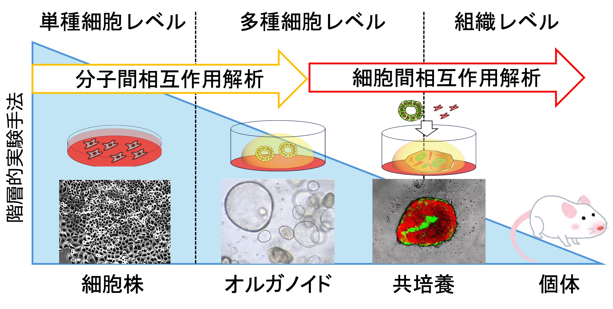 私たちは、これら二つの制御メカニズムを理解するために、最も単純な単一細胞種の培養系から、多細胞種を含むオルガノイド培養系、多種細胞共培養系、さらには動物実験までを階層的に用い、細胞内分子間相互作用から細胞間相互作用に至るまでの研究を進めています。主な研究対象は膵臓組織であり、正常組織における生体防御機構や、膵がん組織における抗がん剤耐性獲得メカニズムの解明に取り組んでいます。こうした研究を通して、正常な細胞とがん細胞の違いを分子レベルで理解し、その知見を新しい治療法の開発や生命現象の理解の深化につなげることを目指しています。