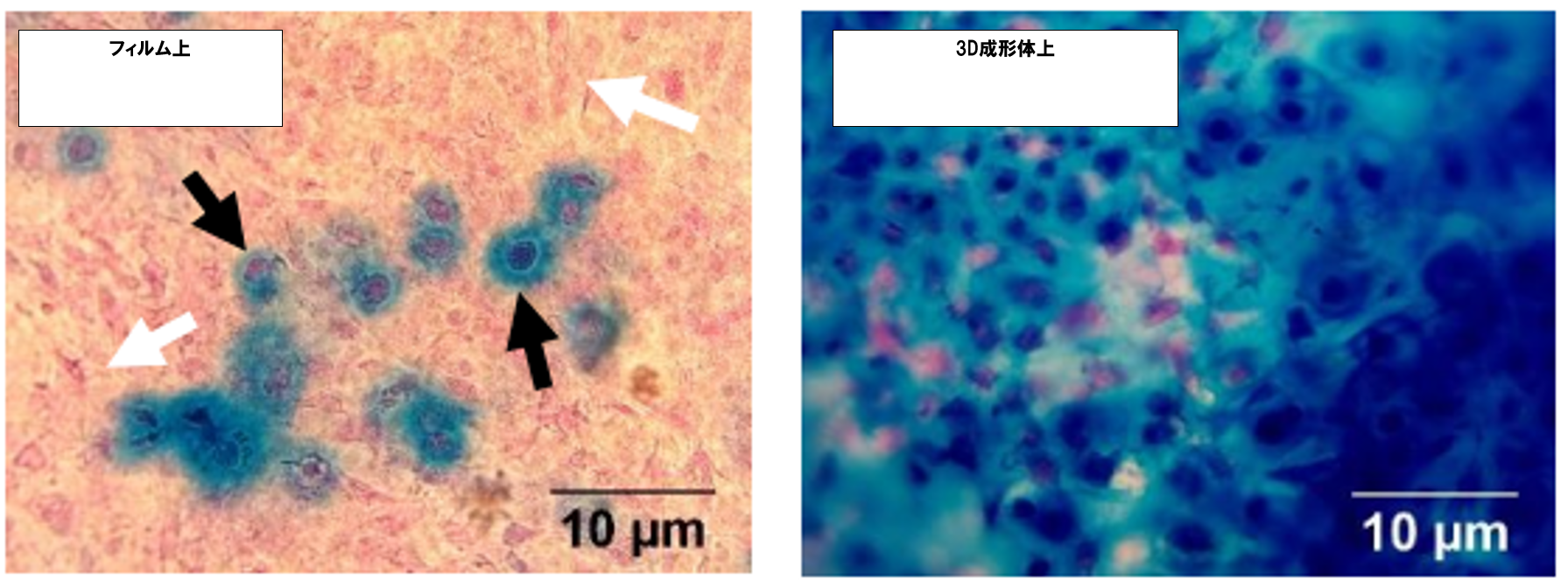 図2 バイオポリマー(ポリ乳酸)で作ったフィルム(左)および3D成形体(右)上における軟骨細胞の増殖・分化の様子。写真で紫色に染まっているところが形成された軟骨組織で、3D成形体上においてより活発に軟骨組織が形成されていることがわかる。