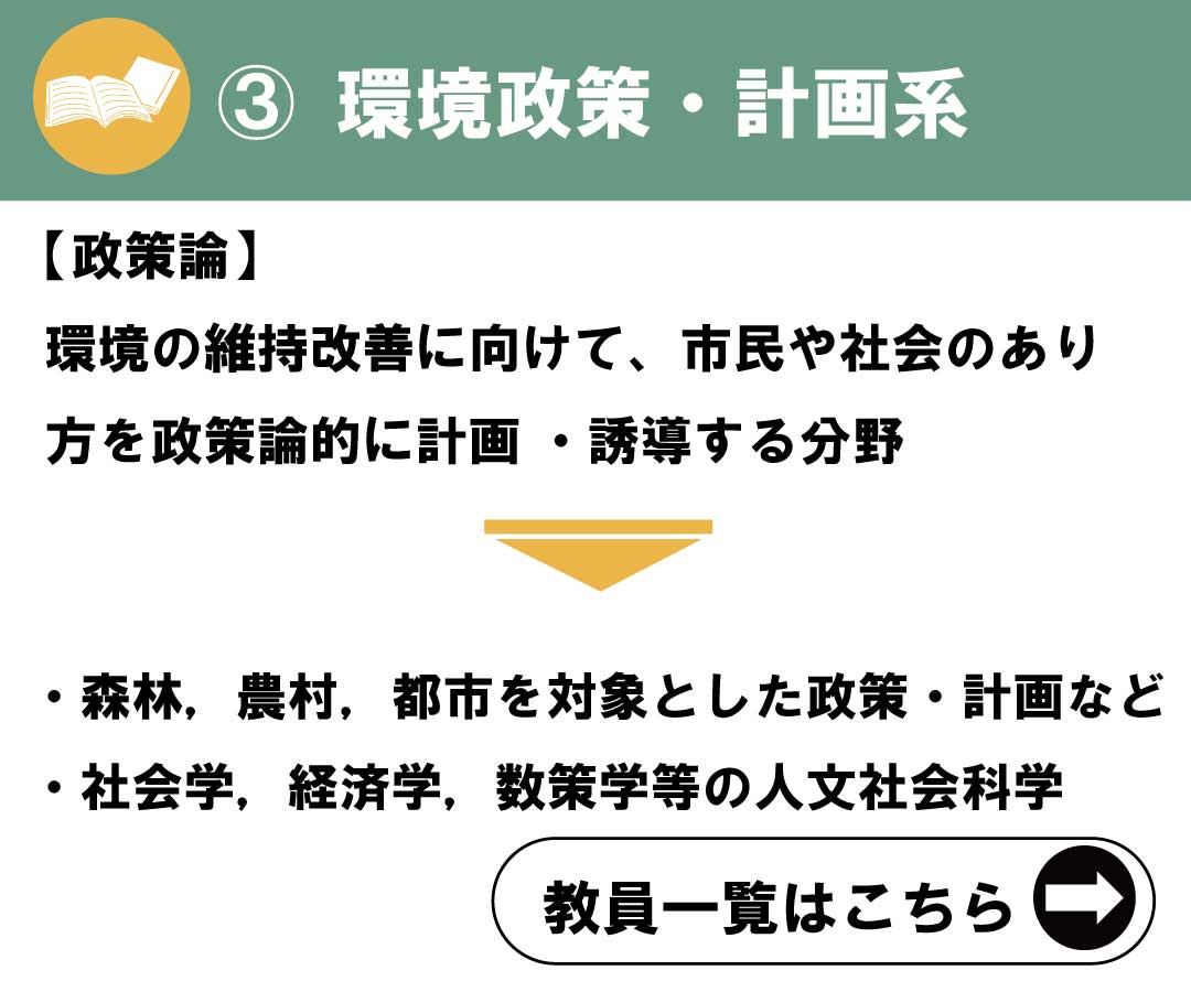 地域環境科学が目指すのは山村から農村、都市に至る「地域」を対象した「環境科学」です。ものの捉え方やアプローチによって大きく3つに分けることができます。自分の興味がある分野を見つけてください。