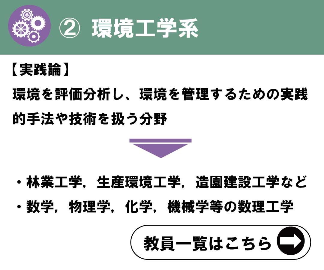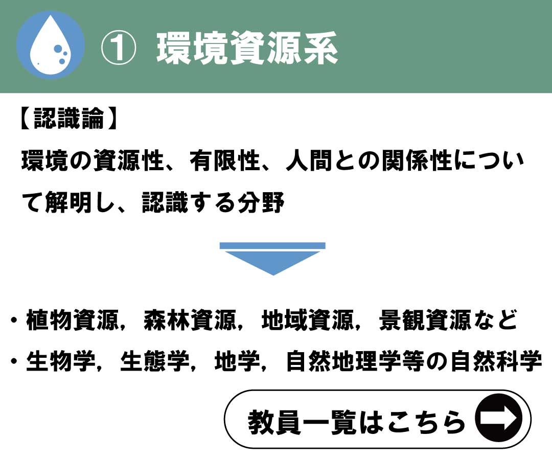 地域環境科学部には、森林総合科学科、生産環境工学科、造園科学科、地域創成科学科の4つの学科があります。これら4学科は人材育成目標こそ異なっていますが、山村地域から農村地域を経て都市地域に至る「地域」を対象とし、これを「環境科学」の視点で横断的かつ総合的に捉えることによって、自然的側面と社会的側面の両面から教育・研究を行うという共通項を持っています。この共通項が、当学部の名称であり、教育・研究の背骨でもある「地域環境科学」という学問体系の大枠であり、その内部は「環境資源系」、「環境工学系」、「環境政策・計画系」の3つの専門分野に分けられます。そして、当学部はこの「地域環境科学」に立脚して、ミクロな地域環境問題からマクロ・グローバルな広域環境問題の解決に貢献できる人材を養成し、地域全体を発展させながら自然と人間が共生できる「循環型社会」の実現を目標にしています。