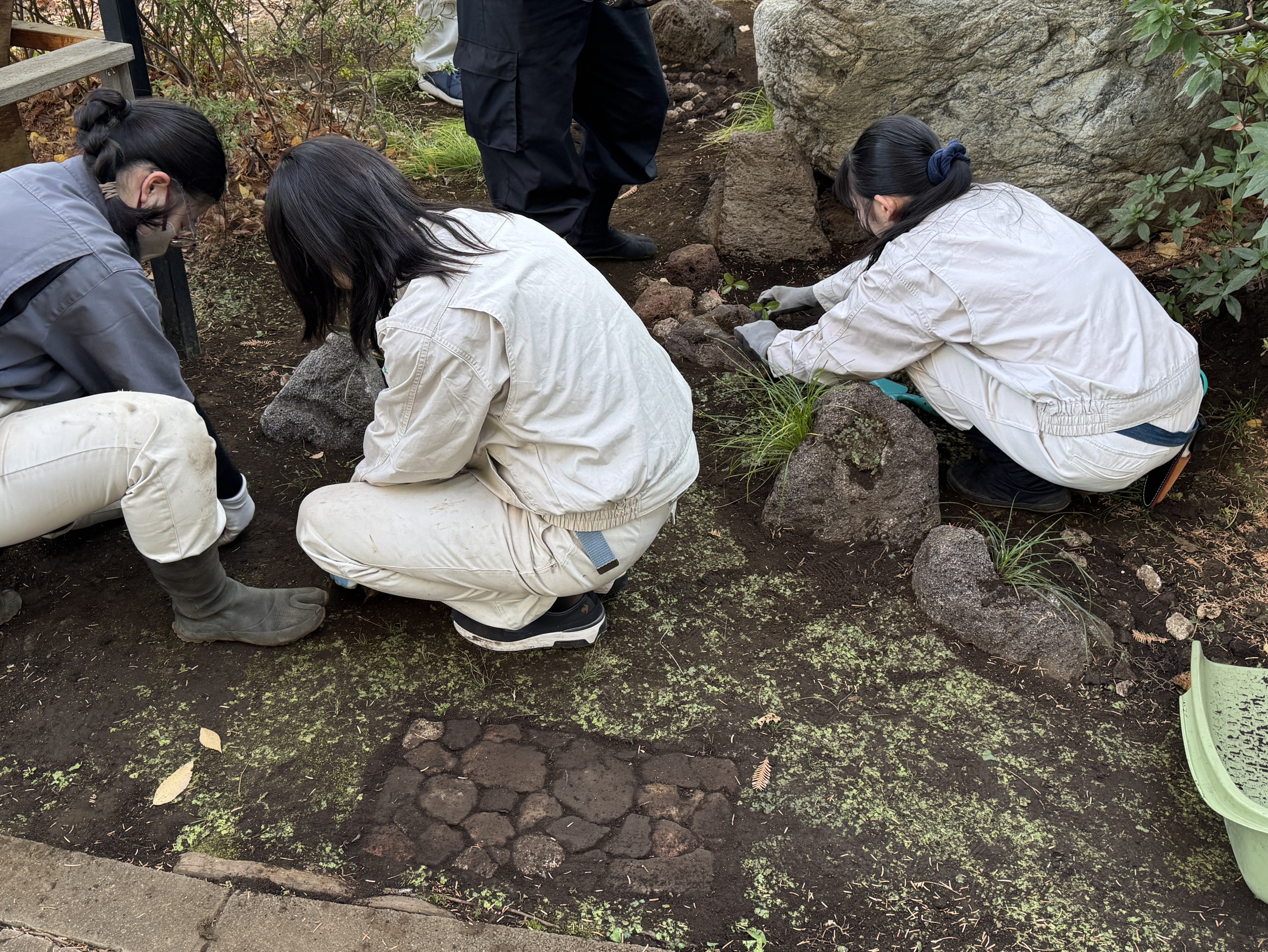造園のゴールは、魅力的な世界を地上に実現することです。本演習は造園材料、とりわけ石材と木材に着目し、実際に手で触り、土を動かし、材料の特性を生かした造園施工により実空間を創造する授業です。厚木キャンパスにおけるつばき園の階段・土留め、散策路づくり、世田谷キャンパスにおける石組・ロックガーデンづくりなどを通じて、石材の見方、木材の特性を理解し、基礎的な施工技術・方法を修得することを目的とします。