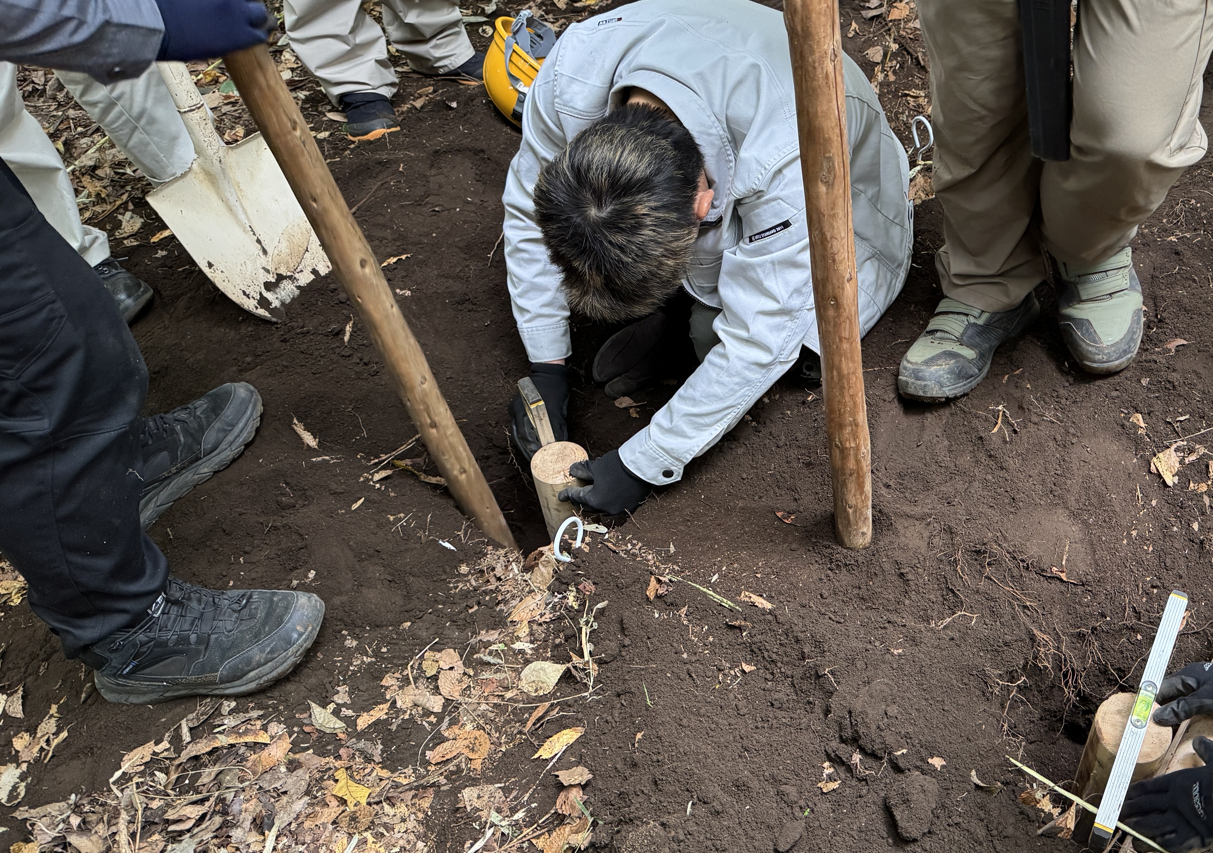 椿園での階段づくり。杭の水平垂直をとり、土を足し入れながら突き固めていきます。