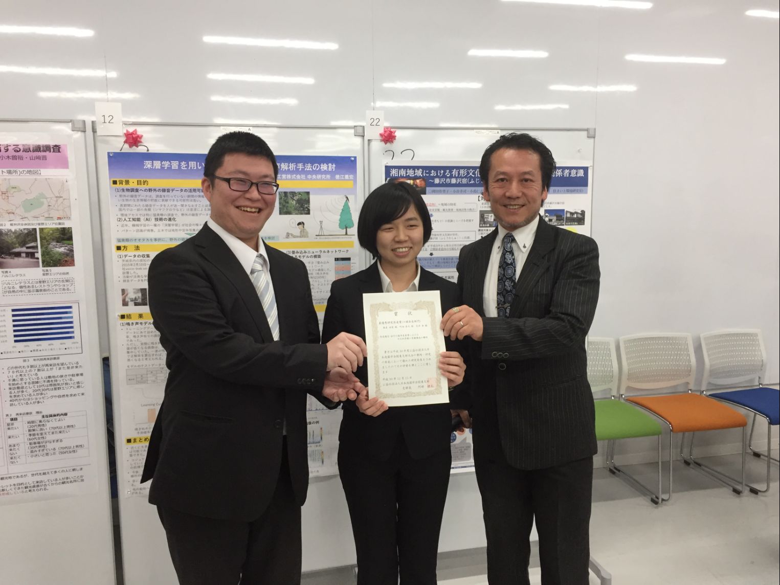 ホーム造園科学科ニュース平成30年度日本造園学会関東支部大会「最優秀研究発表賞」受賞 奥泉 由有さん、町田 彰久さん、荒井 歩 准教授(造園科学科) 平成30年度日本造園学会関東支部大会「最優秀研究発表賞」受賞 奥泉 由有さん、町田 彰久さん、荒井 歩 准教授(造園科学科) 奥泉 由有さん(造園学専攻博士前期課程2年)、町田 彰久さん(造園科学科研究生)、荒井 歩 准教授(造園科学科)は、平成30年度公益社団法人日本造園学会関東支部大会(平成30年12月15日/宇都宮大学)において、最優秀研究発表賞(口頭発表部門)を受賞しました。題目:安行の植木生産業における文化的景観の景観構造の解明(写真は左から町田さん、奥泉さん、阿部支部長) 学会賞等受賞一覧
