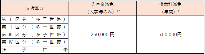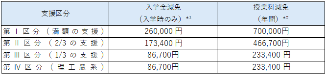 *² 上表は4月から9月(前期)と10月から3月(後期)で同一支援区分の場合の授業料減免額
