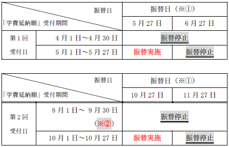 (2)「学費延納願」を下表の請求回毎に提出することで口座振替を停止(「解約」とは異なる)することができます。