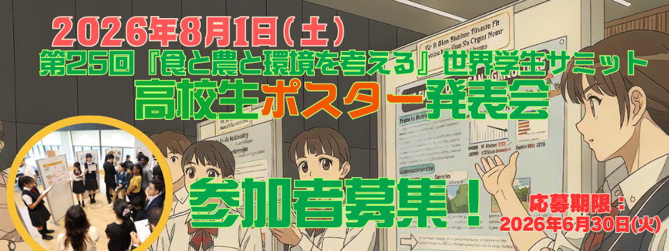 第25回「食と農と環境を考える世界学生サミット」 高校生ポスター発表とは、SDGsの達成に向けて高校生ならではの視点で取り組んでいる活動(活動計画を含む)について発表する場です。現在、2026年の参加者を募集しています!