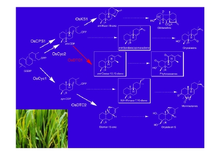 イネにも病原菌に対する防御機構が存在します。植物は動いて逃げたりすることができませんが、その代わりに物質を使って外的から身を守っています。病原菌に感染しないように抗菌物質を生産したり、害虫が寄ってこないように嫌な臭いを出したり。こういった物質の中でユニークな物質として、ファイトアレキシンという一連の物質群があります。ファイトアレキシンは、正常な植物体には存在しませんが、病原菌の感染のような外的からの攻撃を受けると生合成される抗菌活性がある物質です。すなわち、植物の最終防御システムなのです。イネいもち病菌に対して発動するファイトアレキシンはこれまでいくつか知られていました。しかし、その化合物がどの酵素で生合成されるのか、すなわちどの遺伝子がファイトアレキシンの生合成を制御しているのかは全くの謎でした。そこで、資源研では、ファイトアレキシンの生合成における中間体と考えられる物質を化学的に合成し、そのサンプルを用いてファイトアレキシン生合成に関与する酵素の特定、さらにはその酵素をコードする遺伝子の特定に取り組んでいます。このファイトアレキシンの生合成に関与する遺伝子を解明することで、いもち病菌に強いイネの創出に役立てようと考えています。
