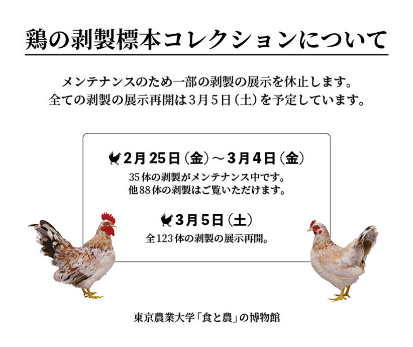 メンテナンスのため一部の鶏剥製の展示を休止します。