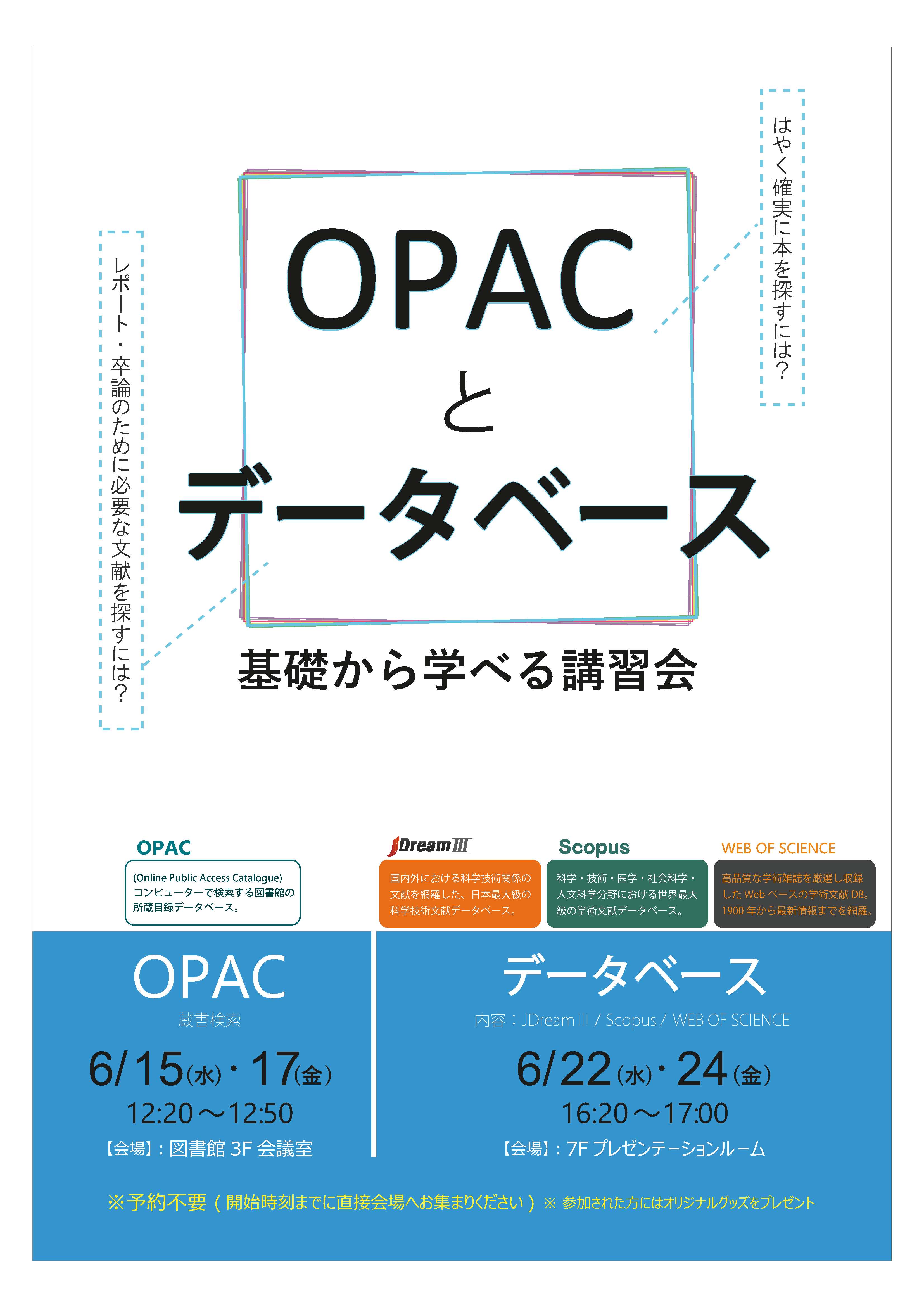 【OPAC講習会】6/15(水)12:20~12:50/【DB講習会】6/22(水),24(金)16:20~17:00