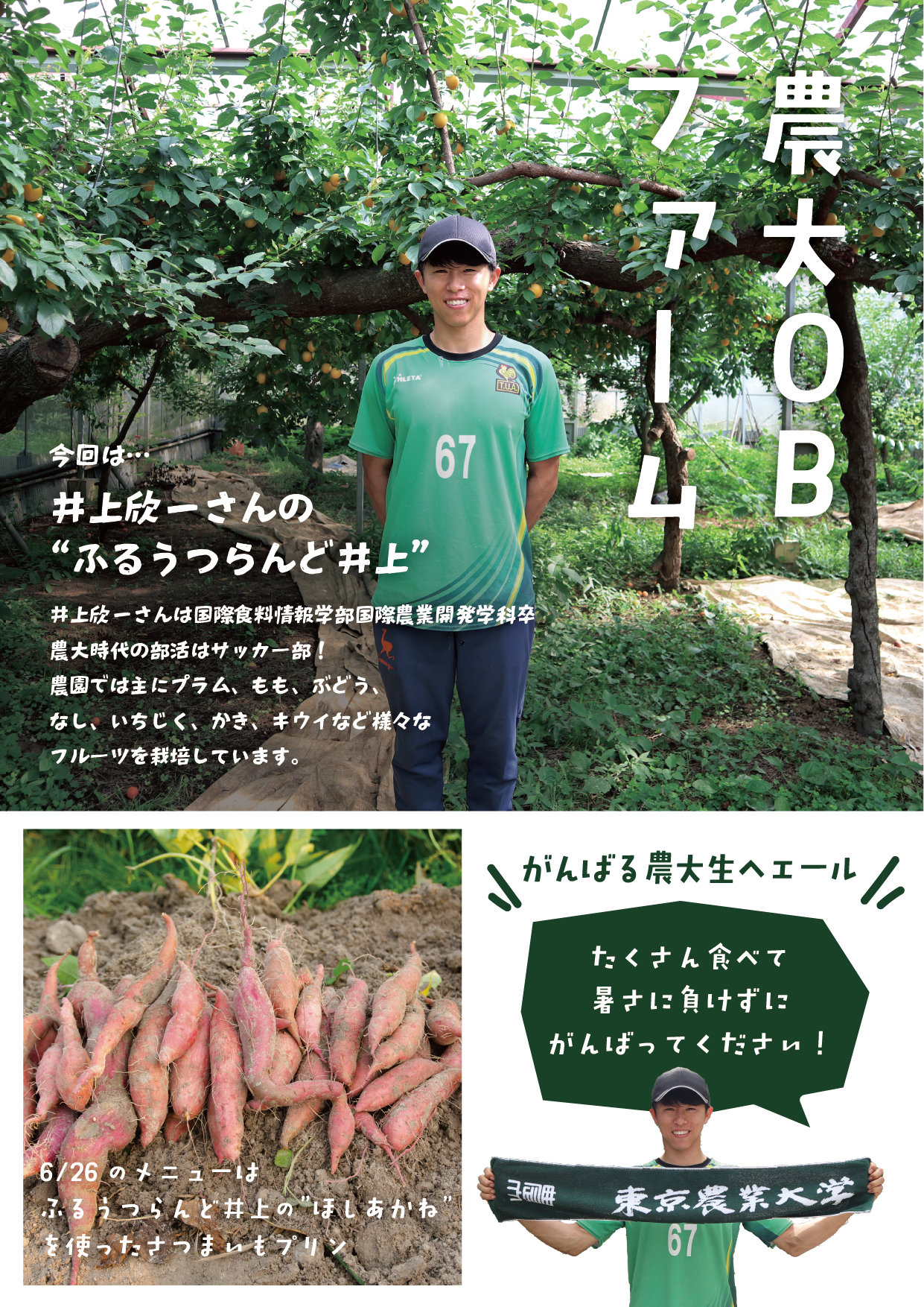 第1弾は、井上欣一さん(国際食料情報学部 国際農業開発学科卒業/サッカー部OB)の作った“ほしあかね”を使った“さつまいもプリン”でした。