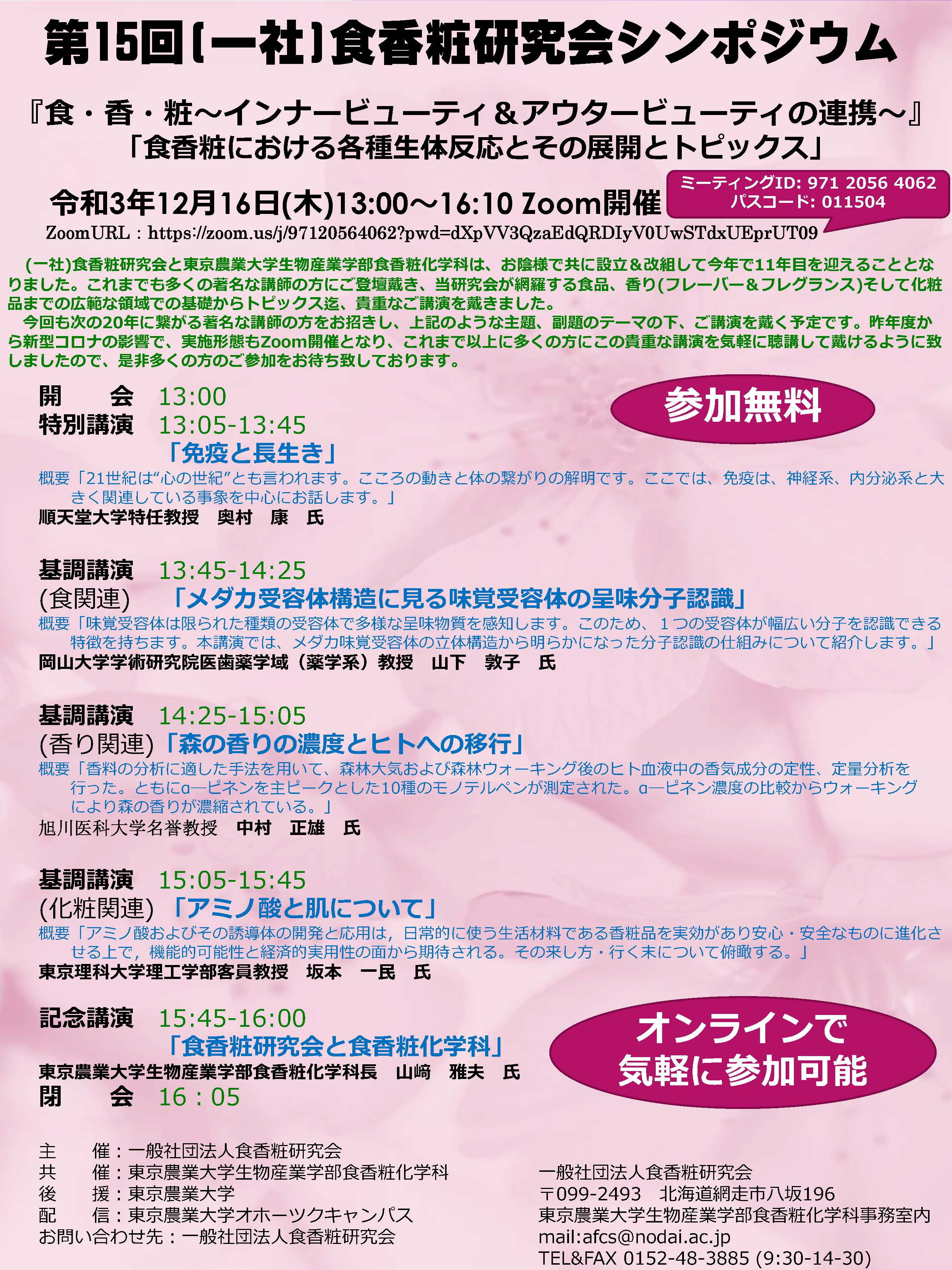 食香粧研究会と東京農業大学生物産業学部食香粧化学科は、お陰様で共に設立&改組して今年で11年目を迎えることとな りました。これまでも多くの著名な講師の方にご登壇戴き、当研究会が網羅する食品、香り(フレーバー&フレグランス)そして化粧 品までの広範な領域での基礎からトピックス迄、貴重なご講演を戴きました。 今回も次の20年に繋がる著名な講師の方をお招きし、上記のような主題、副題のテーマの下、ご講演を戴く予定です。昨年度か ら新型コロナの影響で、実施形態もZoom開催となり、これまで以上に多くの方にこの貴重な講演を気軽に聴講して戴けるように致 しましたので、是非多くの方のご参加をお待ち致しております。