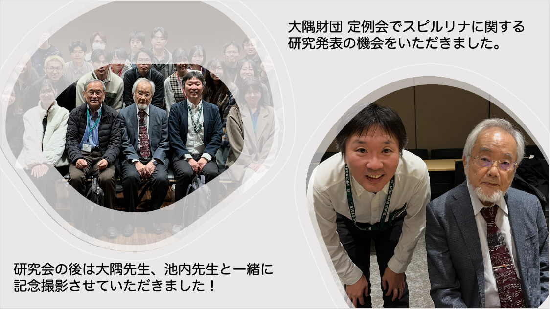 11月13日に東京農業大学世田谷キャンパスにおいて開催された大隅基礎科学創成財団 微生物コンソーシアム 第15回全体会「有用シアノバクテリア”スピルリナ”研究のこれから」において、バイオサイエンス学科 渡辺智教授が登壇し、講演しました。