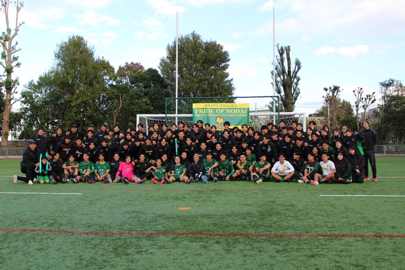 試合後には、「地域貢献活動」を学生たちが企画し、近隣小学校の子供たちにサッカー教室を行いました。200名以上が参加し、東京農大生と楽しく一緒にボールを蹴り交流しました。