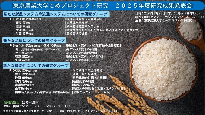 東京農業大学は3月26日(木)、世田谷キャンパス国際センターにて「東京農業大学こめプロジェクト研究 2025年度研究成果発表会」を開催しました 。