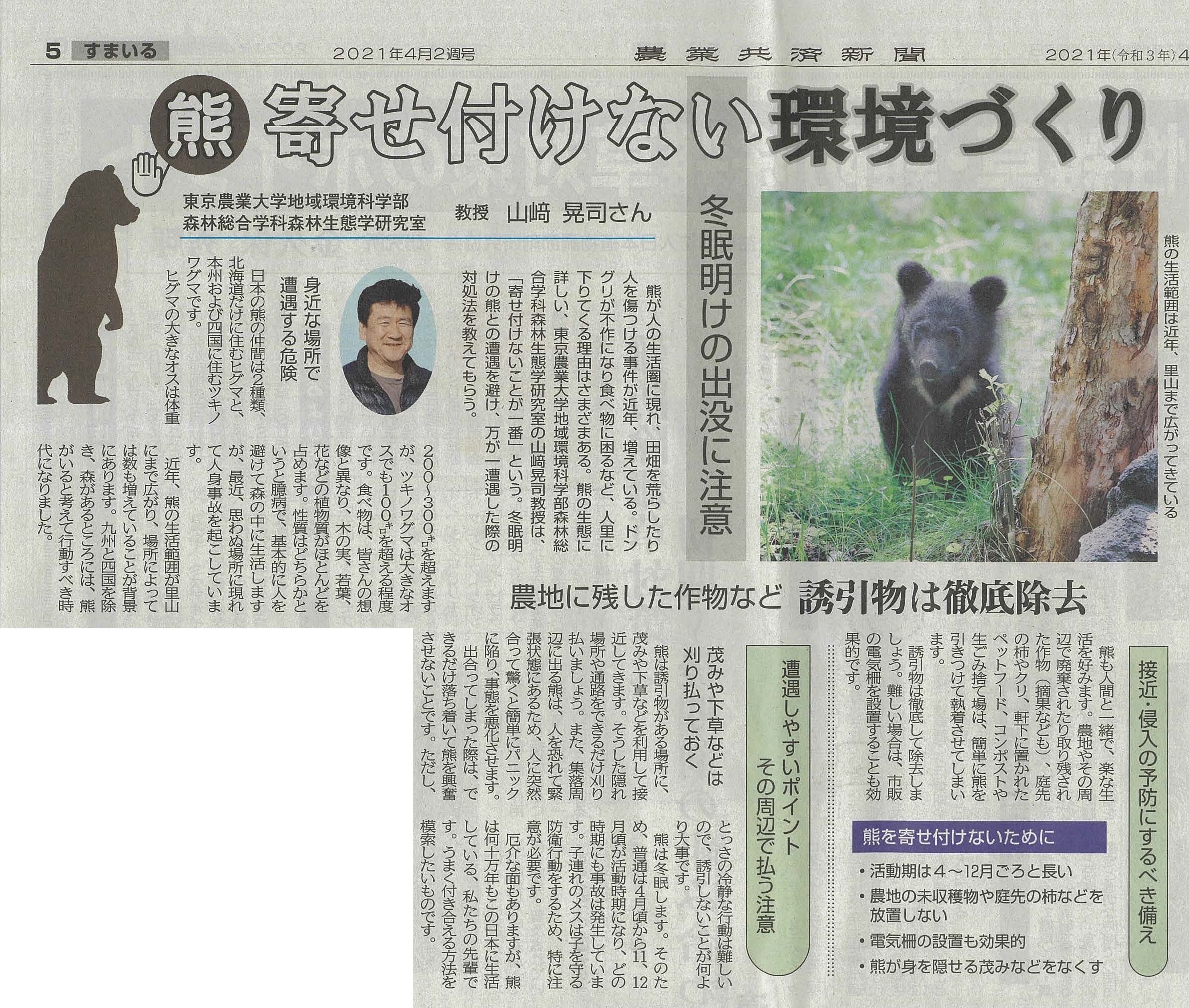 ホームニュースリリースメディア森林総合科学科 山崎 晃司 教授が農業共済新聞に取材協力しました。 森林総合科学科 山崎 晃司 教授が農業共済新聞に取材協力しました。 2021年4月8日 メディア 森林総合科学科 山崎 晃司 教授が4月7日(水)発行 農業共済新聞に取材協力しました。 「熊を寄せ付けない環境づくり」をテーマに、冬眠明けの熊の出没についてコメントしています。 2021年4月7日発行 農業共済新聞 (2021年4月7日 発行 農業共済新聞) 山崎教授 研究室 山崎教授 研究実績(日本語) 山崎教授 研究実績(English) 前のページ 次のページ