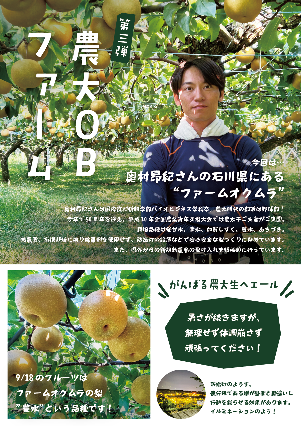 第3弾は、奥村昴紀さん(国際食料情報学部 国際バイオビジネス学科卒業/野球部OB)の作った“梨”でした。