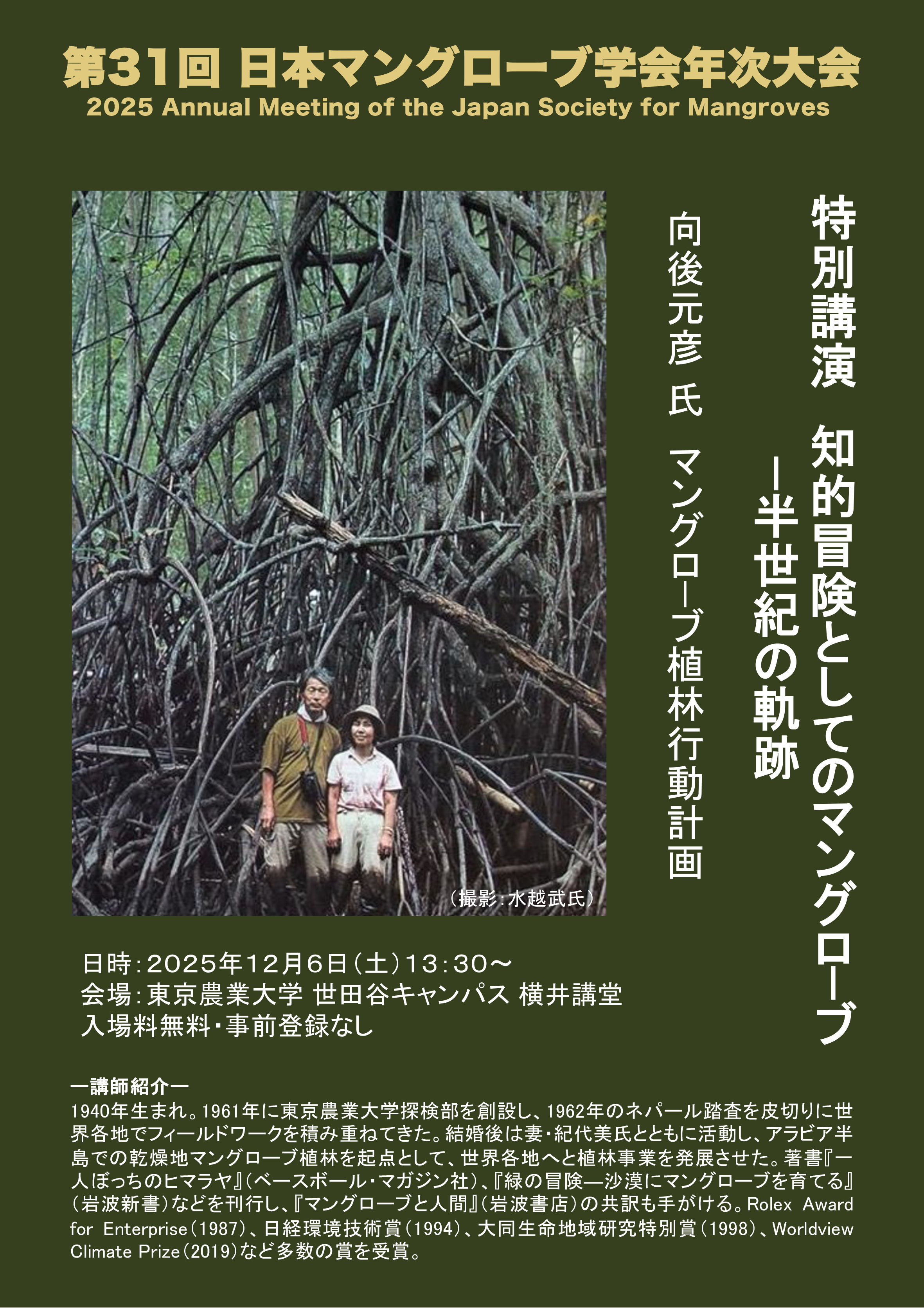 「第31回 日本マングローブ学会年次大会」では13:30より、東京農業大学卒業生で探検家の向後 元彦(こうご もとひこ)さんによる特別講演「知的冒険としてのマングローブ — 半世紀の軌跡」が行われる他、一般の部、中高生の部にわかれた口頭発表等も実施します。