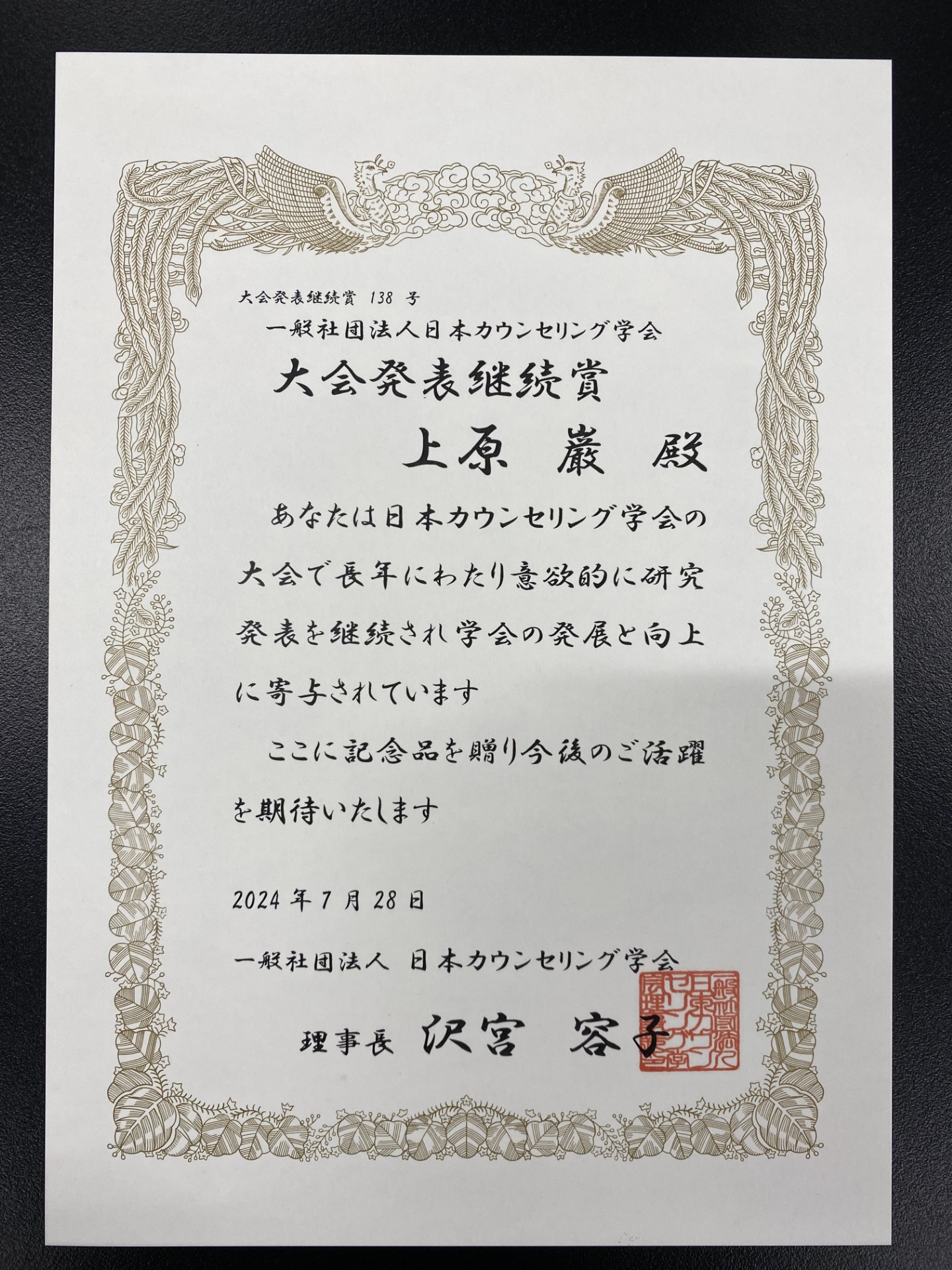 一般社団法人 日本カウンセリング学会「大会発表継続賞」