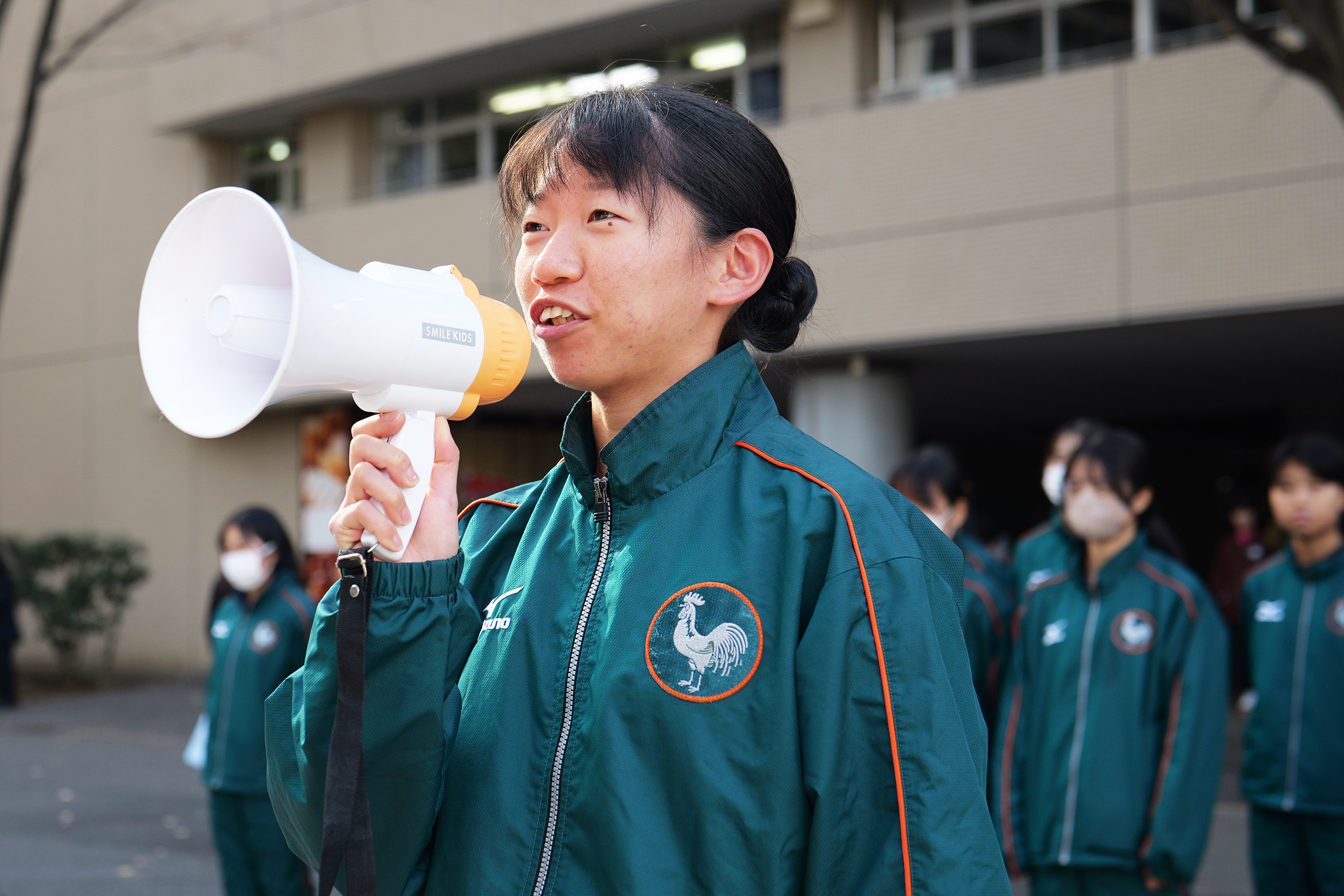 全学応援団と会場に集まった教職員、学生たちによる応援を受け、選手を代表して小田木 陽和さん(国際食農科学科 4年)は「仙台の駅伝から今日に至るまで各々が“自分に足りない力は何か?”を考え、工夫して練習に取り組めています。このメンバーで戦う最後の全国規模の駅伝となり、やり直しはできません。感謝の気持ちを胸に、ひとつでも上の順位を、一秒でも速いゴールを目指し、残り限られた時間を大切に万全の態勢で挑みます」と抱負を述べ、更なる応援を呼びかけました。