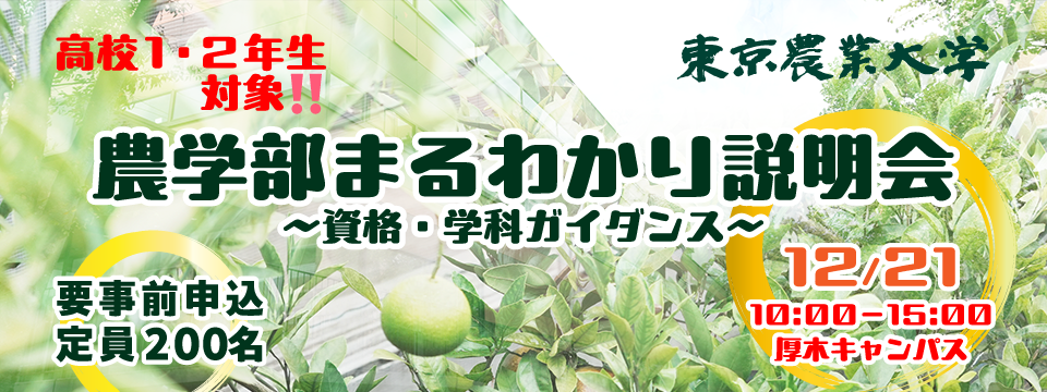 厚木キャンパス 農学部 入学センターは12月21日(日)、厚木キャンパス 講義棟M2階 トリニティホールにて高校1・2年生を対象とした「農学部まるわかり説明会 ~資格・学科ガイダンス~」を開催します。