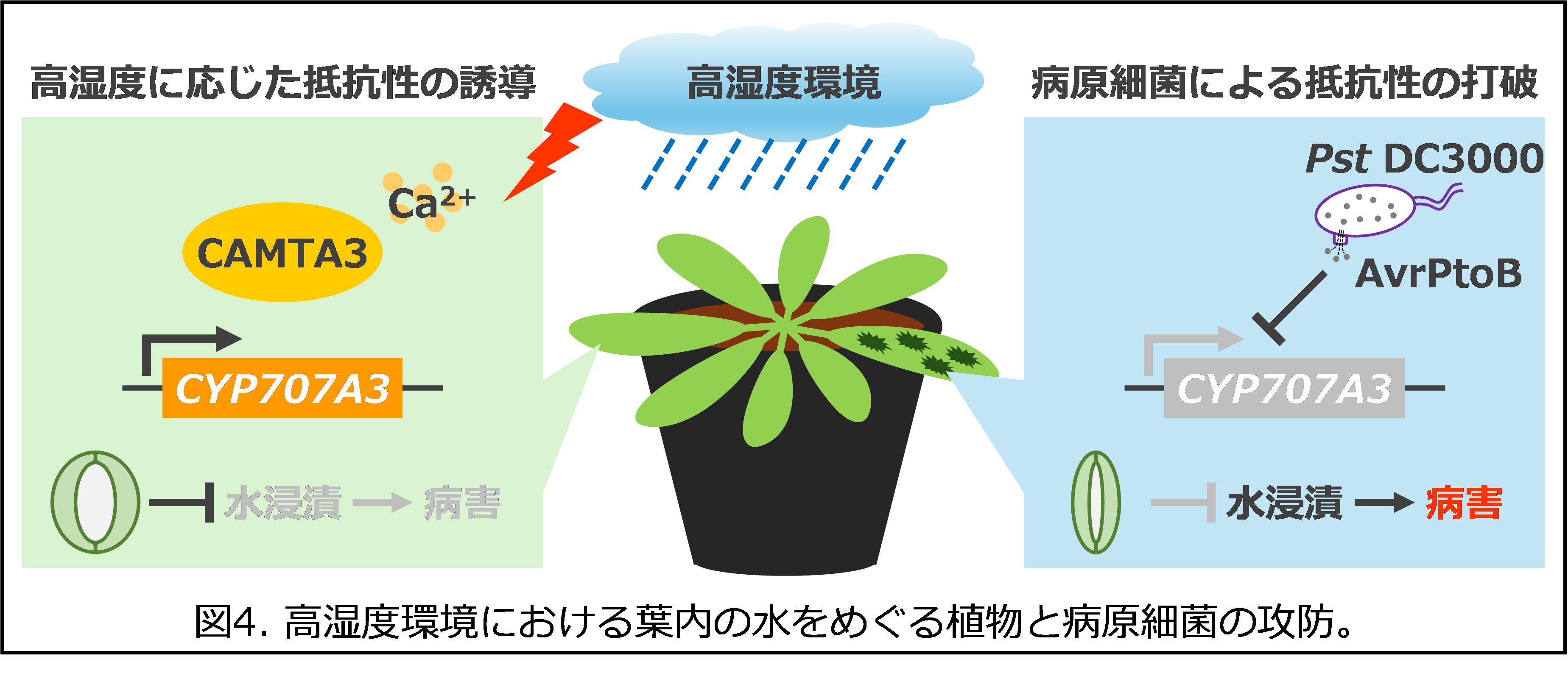 さらに研究グループは、病原細菌がどのエフェクターを用いてこの防御機構を抑制しているのか、さらに解析を進めました。その結果、特にエフェクターAvrPtoBが、CYP707A3を介した水浸漬抵抗性の阻害に寄与していることを突き止めました。AvrPtoBを植物内で発現させると、高湿度下で本来誘導されるはずのCYP707A3遺伝子の発現が著しく抑制され(図3)、水浸漬に対する抵抗性が低下しました。また、AvrPtoBを欠損した病原細菌Pst DC3000変異株を接種した植物では、CYP707A3の発現が高湿度で誘導されたまま維持され、水浸漬の形成が大きく抑えられました。これらの結果から、病原細菌Pst DC3000はAvrPtoBを用いて植物のABA分解を止めることで、植物の保水機能を利用し、自身の増殖に有利な水集積環境を葉内に作り出していることが示されました。すなわち、植物は湿度上昇を感じた時点で水浸漬を防ぐための防御機構を発動すること、及び病原細菌はそれを打ち破って植物の保水機構を利用する仕組みを備えていることを発見し、植物と病原細菌が葉内の「水」をめぐって繰り広げる攻防を左右する分子標的が、本研究によって明確になりました(図4)。