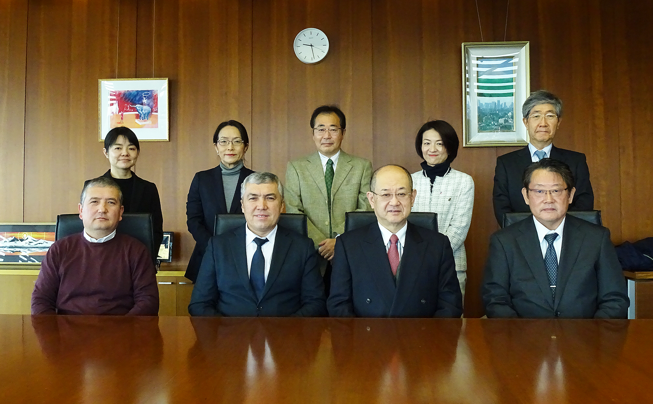 ウズベキスタン共和国・サマルカンド農業イノベーション研究大学(Samarkand Agroinnovations and Research University)のシャフカット・ハサノフ (Shavkat Hasanov)学長と 経済ビジネス学部の学部長のソディキオン・ママソリエフ(Sodiqjon Mamasoliev)学部長が東京農業大学を表敬訪問し、江口 文陽 学長、三原 真智人 副学長、グローバル連携センター 宮浦 理恵 センター長、後藤 菜穂 事務部長、研究面でウズベキスタンに関連する国際食料情報学部 入江 憲治 学部長、農芸化学科 犬伏 和之 教授、国際農業開発学科 入江 満美 准教授が世田谷キャンパス アカデミアセンターの一室で一行をお迎えしました。