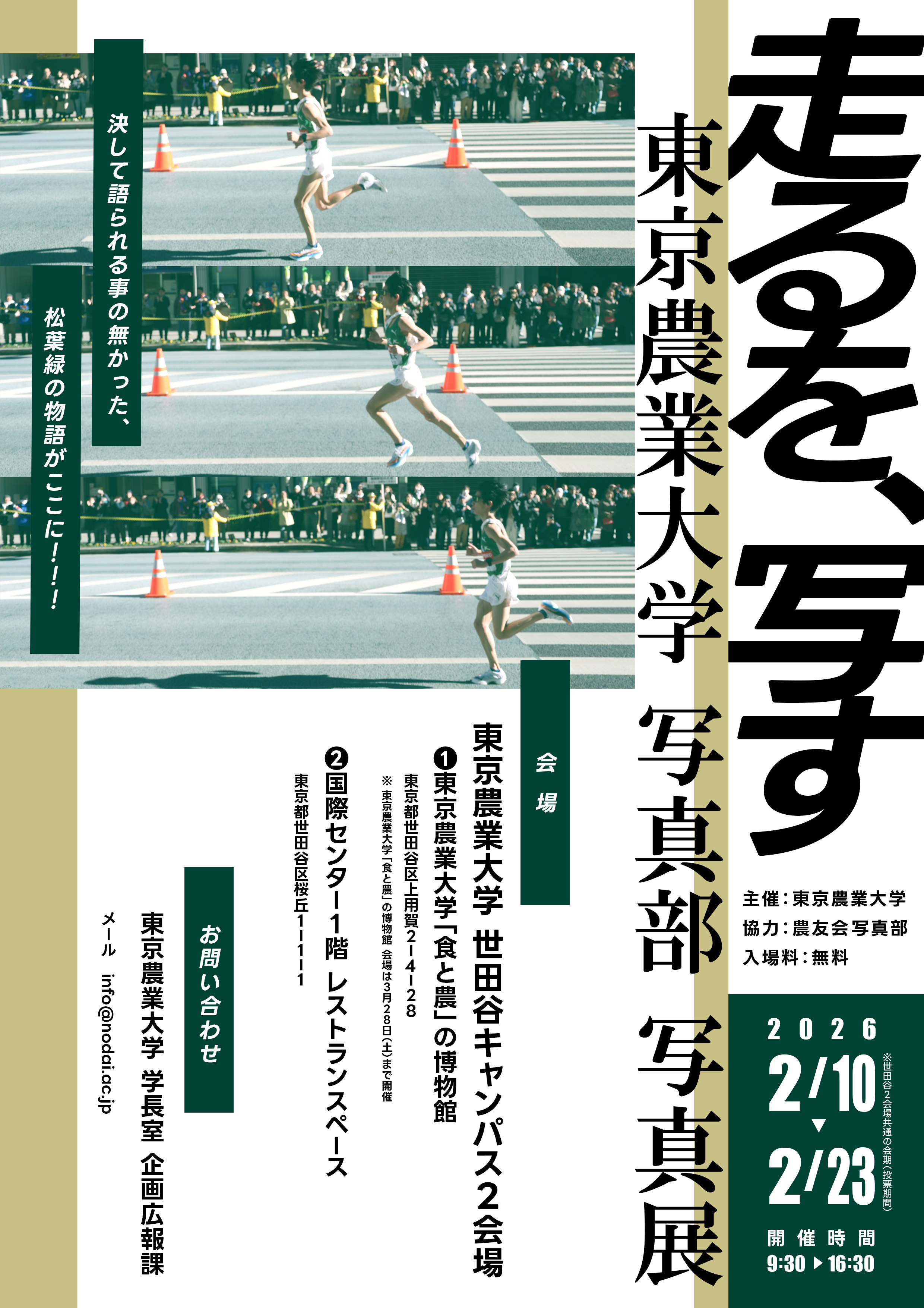 東京農業大学が主催し、農友会 写真部が協力して開催する写真展「走るを、写す」東京農業大学 写真部 写真展を2月10~23日の期間、世田谷キャンパス2会場で開催します。