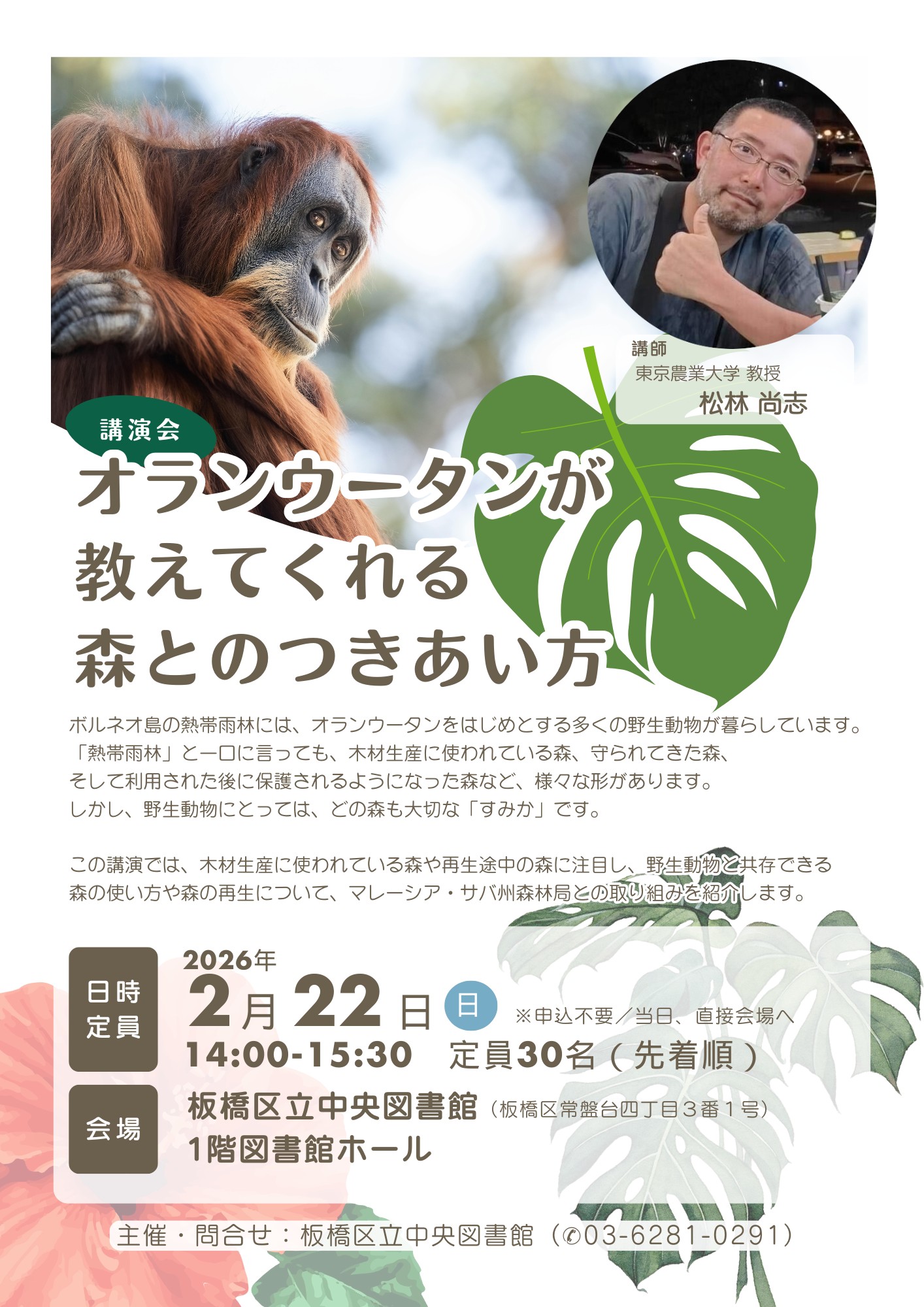 生物資源開発学科 松林 尚志 教授が2月22日(日)、板橋区立中央図書館にて開催される講演会「オランウータンが教えてくれる森とのつきあい方」で、マレーシア・サバ州森林局と取り組む、野生動物と共存できる森の使い方や森づくりの話をします。