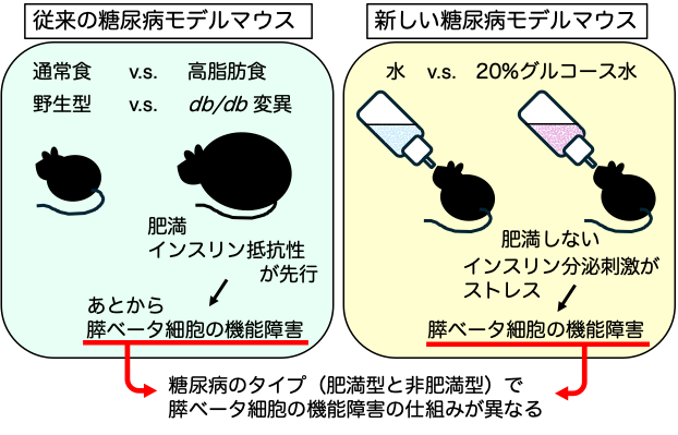 従来は、糖尿病モデルマウスとして、遺伝的に過食・肥満のdb/dbマウスや、高脂肪食を数ヶ月にわたって与え続けるモデルなどが使われてきました。これらは、肥満とインスリン抵抗性が強く出る欧米人に多いタイプの糖尿病のモデルと言えます。一方、本研究では、20%グルコースを含む水を2週間与え続けるだけで、肥満を伴わずに膵ベータ細胞の機能障害が起きることが分かりました。このような簡単な操作で、日本人に多い非肥満型の糖尿病モデルマウスが確立されたことによって、糖尿病のタイプごとに発症の仕組みが異なることが強く認識され、あまりアプローチされてこなかった非肥満型の糖尿病の仕組みの解明や治療法の開発につながることが期待されます。