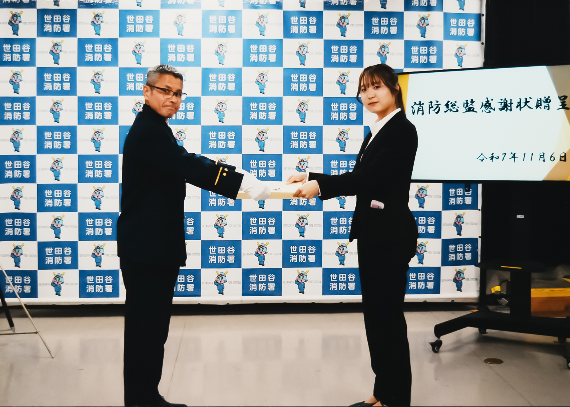 ホームニュースリリースお知らせ山田奏菜子さん(食料環境経済学科4年)が人命救助をし、世田谷消防署から感謝状 山田奏菜子さん(食料環境経済学科4年)が人命救助をし、世田谷消防署から感謝状 2025年11月17日 お知らせ 令和7年10月5日(日)、女子ホッケー部 山田奏菜子さん(食料環境経済学科4年)が複数の方々と119番通報、AED、心臓マッサージを連携し、適切な救命措置を行い男性を救助いたしました。それに伴い、11月6日(木)救助に関係した方々に対し世田谷消防署長から感謝状を贈呈いただきました。 前のページ 次のページ