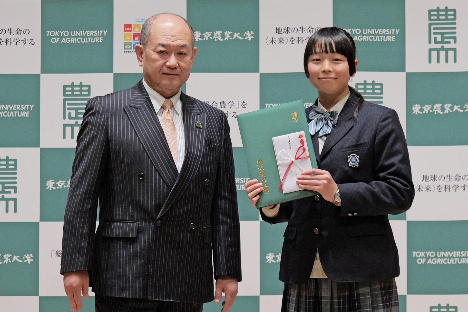 尾本さんは愛媛県大洲市の長浜地域が抱える観光客減少という課題を解決するため、自然観察・観光マップを企画・制作し、配布することで地域の活性化に貢献。東京農業大学の江口 文陽 学長から賞状と副賞が贈られました。