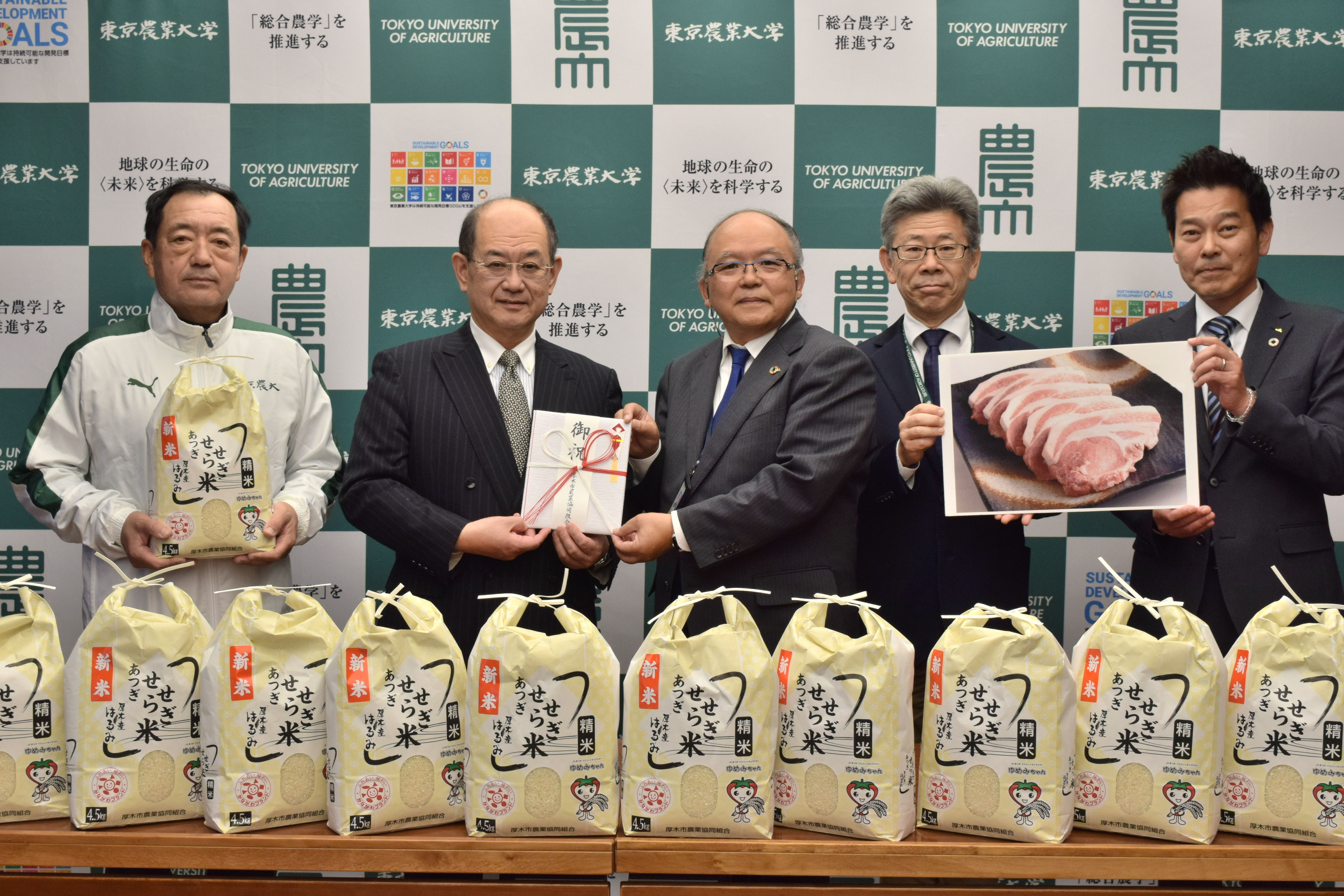 農友会陸上競技部(長距離ブロック 男子)に、11月18日(火)に本学にて、包括連携協定を締結しているJAあつぎ様より今後の活躍と健闘を願い、豚肉80kgとお米「あつぎせせらぎ米」54kgを賜りました。