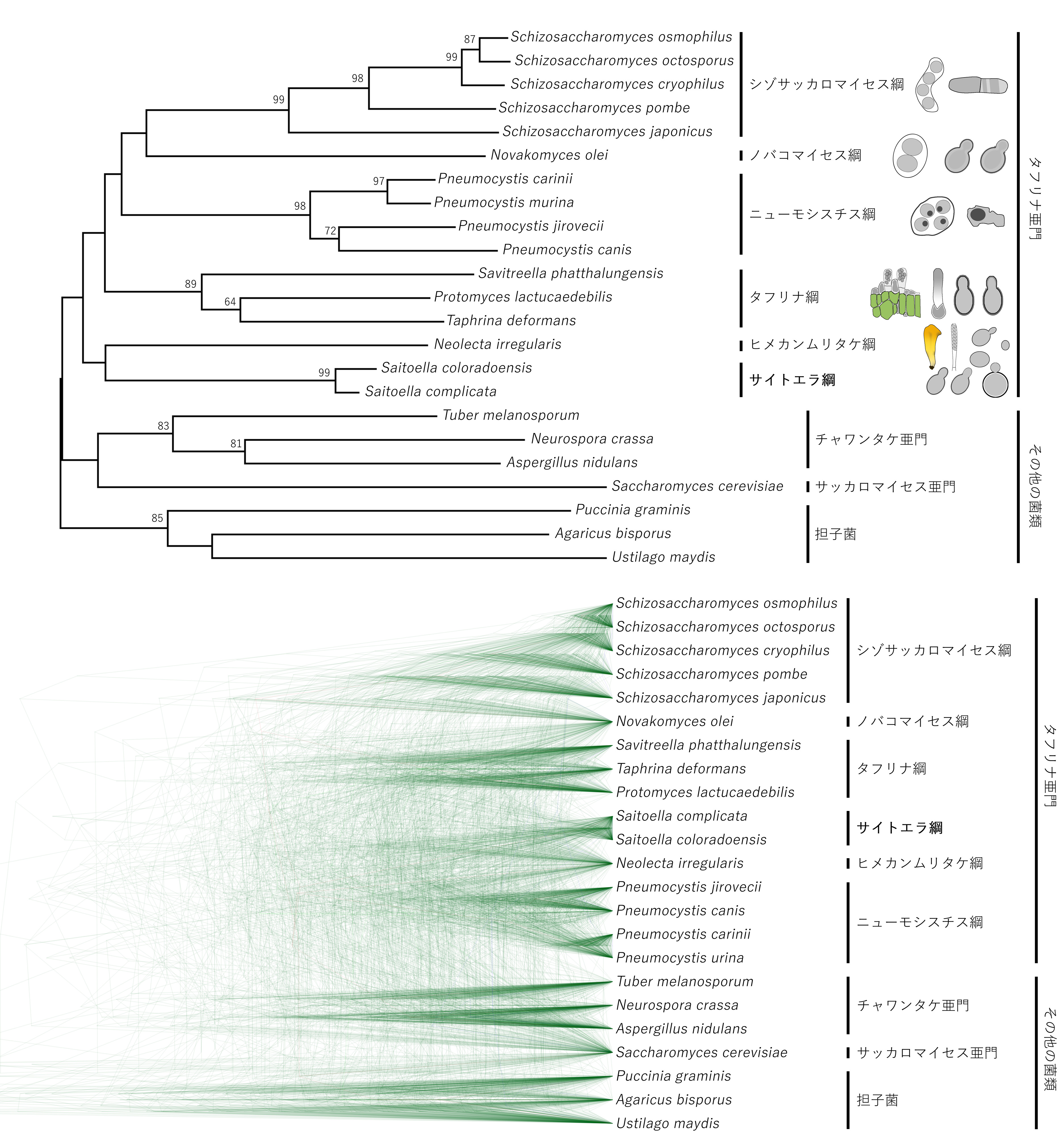 ロングリードシーケンサーを使用してゲノムを解読した結果、それぞれの染色体の全長が繋がったゲノム情報が構築できました。このゲノム情報を基に予測した各相同遺伝子の系統関係から生物種間の系統関係を推定すると、遺伝子配列を連結して推定した結果と同様にサイトエラ属はヒメカンムリタケ綱 (Neolectomycetes) との類縁関係が示唆されたものの信頼性は低く、元となるそれぞれの遺伝子の推定系統関係でも既存のどの分類群と明確に類縁とは言えないものでした(図)。さらに、サイトエラ属は遺伝子のアミノ酸配列が亜門内の多くのグループにとってもっとも類似していることがわかり、亜門内でも祖先的な配列を維持していることが推定されました。このことから、サイトエラ属は既知のグループとは異なる独特の系統であると言え、新綱4)「サイトエラ綱(Saitoellomycetes)」として記載しました。サイトエラ(Saitoella)は微生物学者・斎藤賢道博士5)に因んで献名された属名であり、綱という大きな分類群が日本人の名前を冠するのは珍しいことといえます。